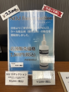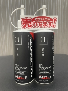 今回はメンテナンスに来られた際によくご質問の多かったNOJリザレクションの紹介です。リザレクションとはスケール除去剤(酸性ケミカル)です。使用用途はコーティング被膜上のスケール汚れを除去する溶剤です。