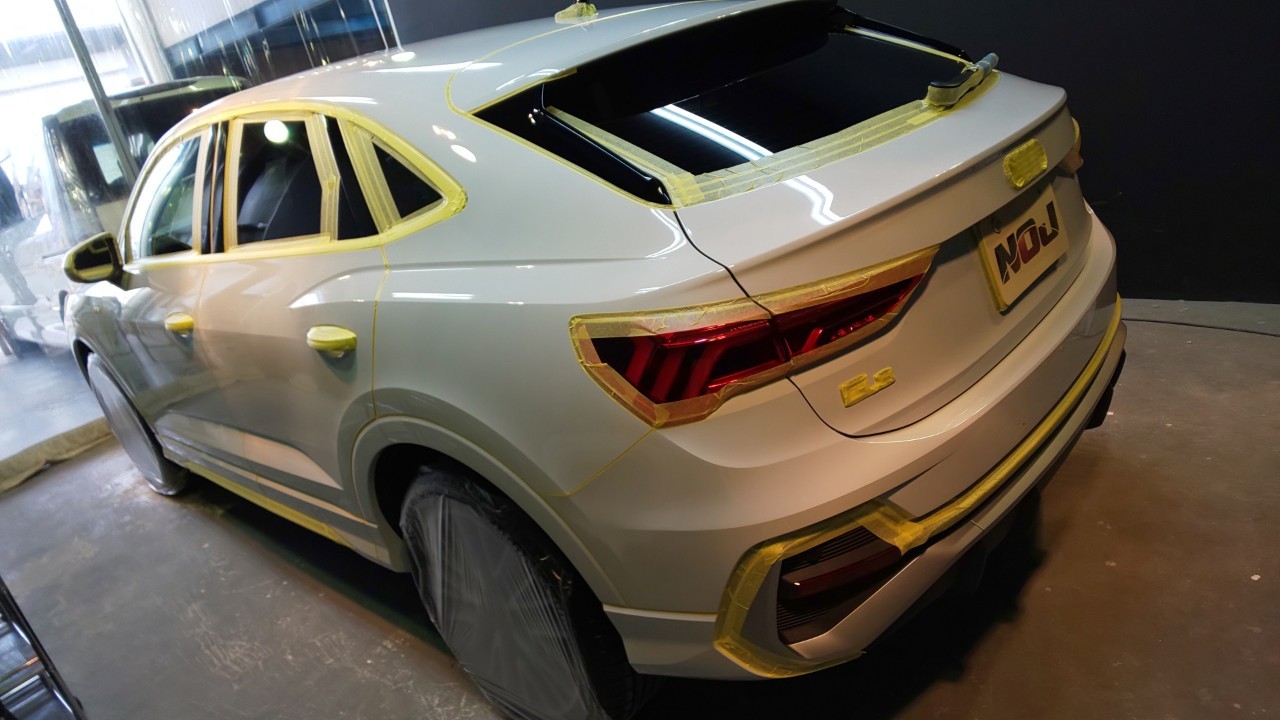 マスキング処理を終えた姿がこちら!ようやく本格的なボディの研磨作業前の下準備が完了です!
