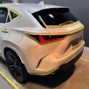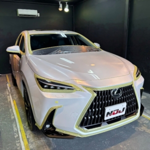 このようにNOJはどのおクルマに対しても研磨を施しますので、磨けないパーツの保護や塗装パネルの角の保護、隙間に研磨粉が入らないようにマスキング処置を行ないます。