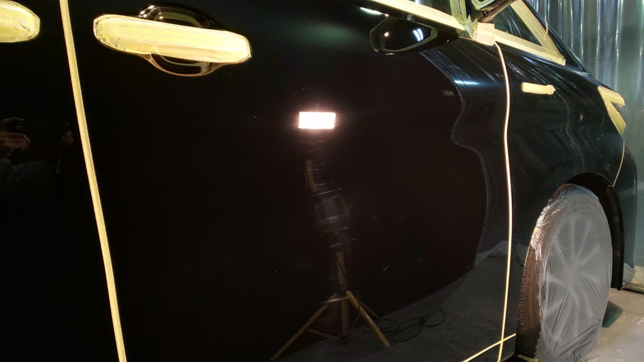 このようにNOJはどのおクルマに対しても研磨を施しますので、磨けないパーツの保護や塗装パネルの角の保護、隙間に研磨粉が入らないようにマスキング処置を行ないます。