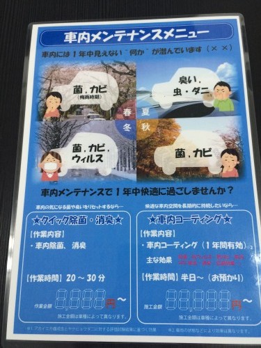 言わば、車内のコーティングです。昨今、色々なアレルギーの原因があります。