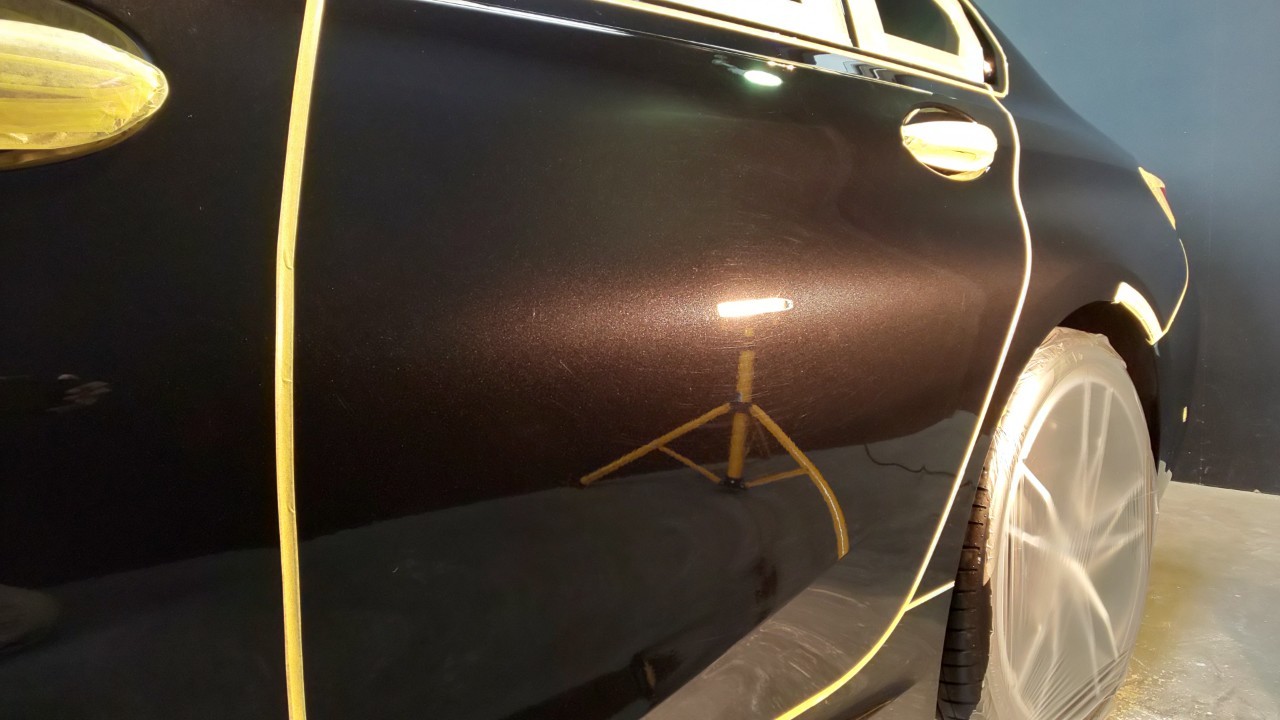 マスキング処理を終えた姿がこちら!ようやく本格的なボディの研磨前作業の下準備が完了です!
