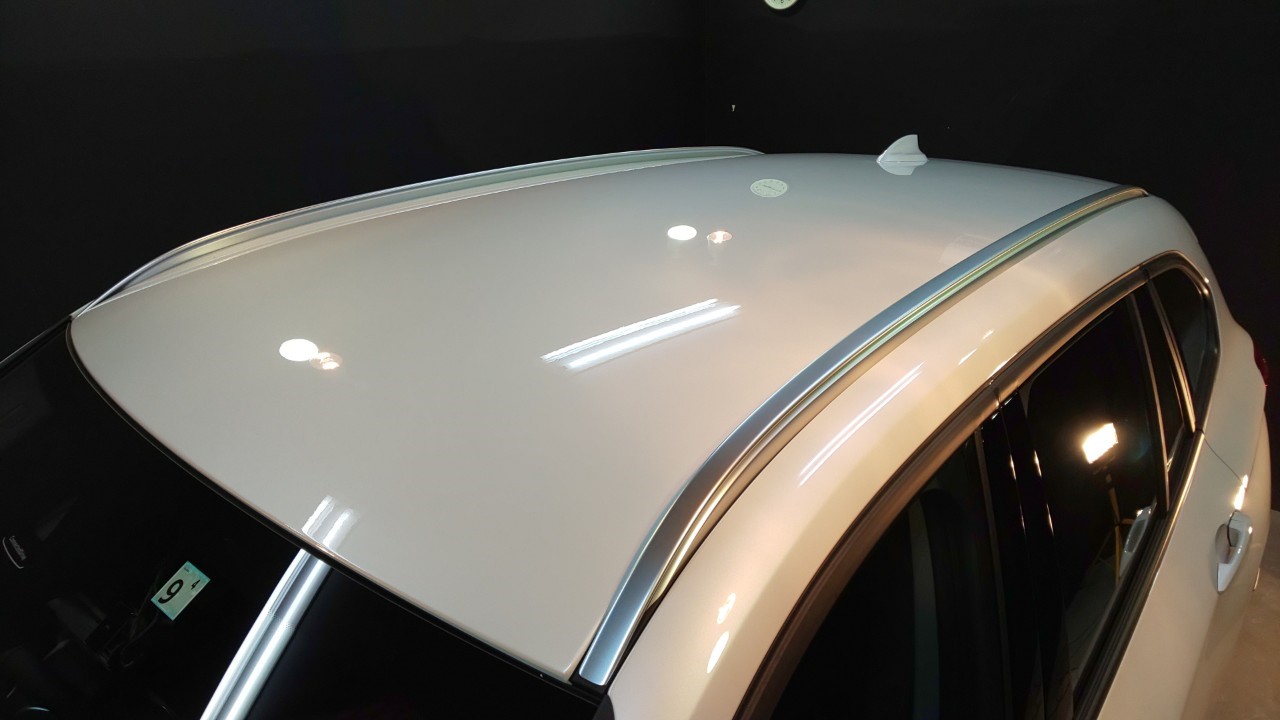 特殊照明設備のブース内にて現車確認を行うと新車でも少なからずスクラッチキズや水アカ、水シミそしてボヤけた塗装表面の曇りが拝見されます。