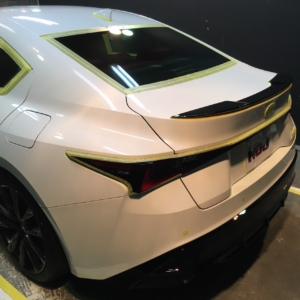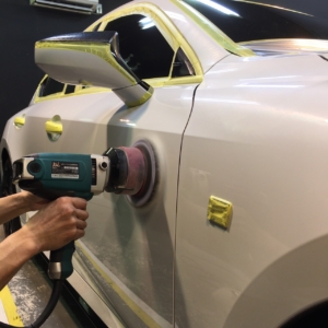 このようにNOJはどのおクルマに対しても研磨を施しますので、磨けないパーツの保護や塗装パネルの角の保護、隙間に研磨粉が入らないようにマスキング処置を行ないます。