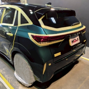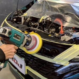 このようにNOJはどのおクルマに対しても研磨を施しますので、磨けないパーツの保護や塗装パネルの角の保護、隙間に研磨粉が入らないようにマスキング処置を行ないます。