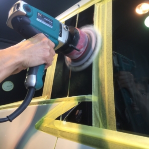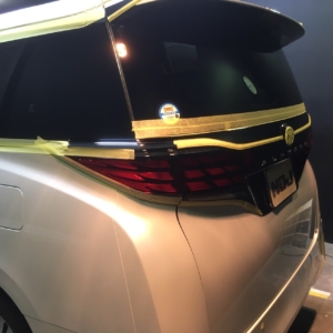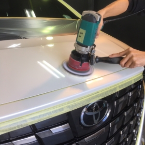 このようにNOJはどのおクルマに対しても研磨を施しますので、磨けないパーツの保護や塗装パネルの角の保護、隙間に研磨粉が入らないようにマスキング処置を行ないます。