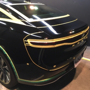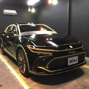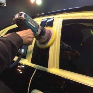 新車でも少なからずあるシミやキズそして新車特有のくすみを除去する為研磨を施しますので研磨粉の進入防止や磨けない箇所のパーツ保護の為しっかりとマスキングを施します!