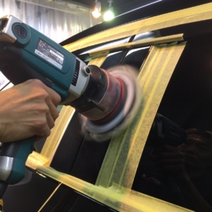 マスキング処理を終えた姿がこちら!ようやく本格的なボディの研磨作業前の下準備が完了です!