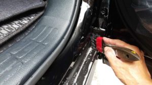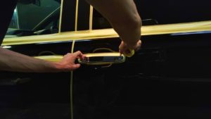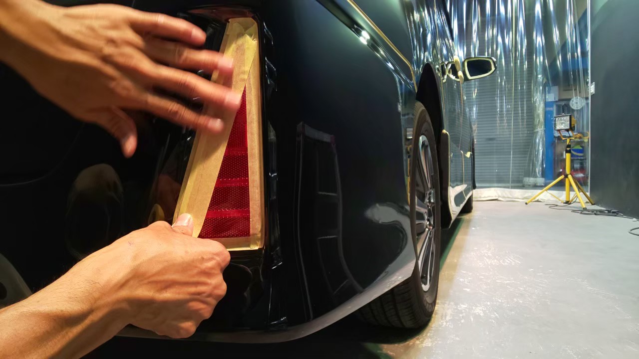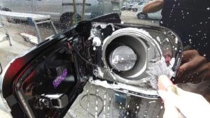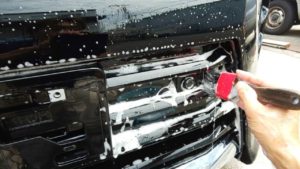 新車でも刷毛等で細部の汚れをケミカル剤にて分解除去しマスキング処理をしていきます。