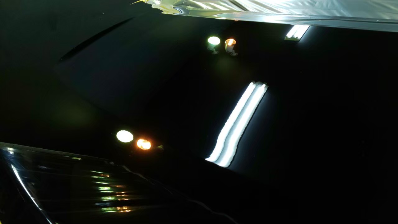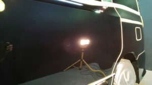 細かなキズを見抜く特殊照明設備の専用ブースにて状態確認を施すと新車でも微細なキズが拝見されます。